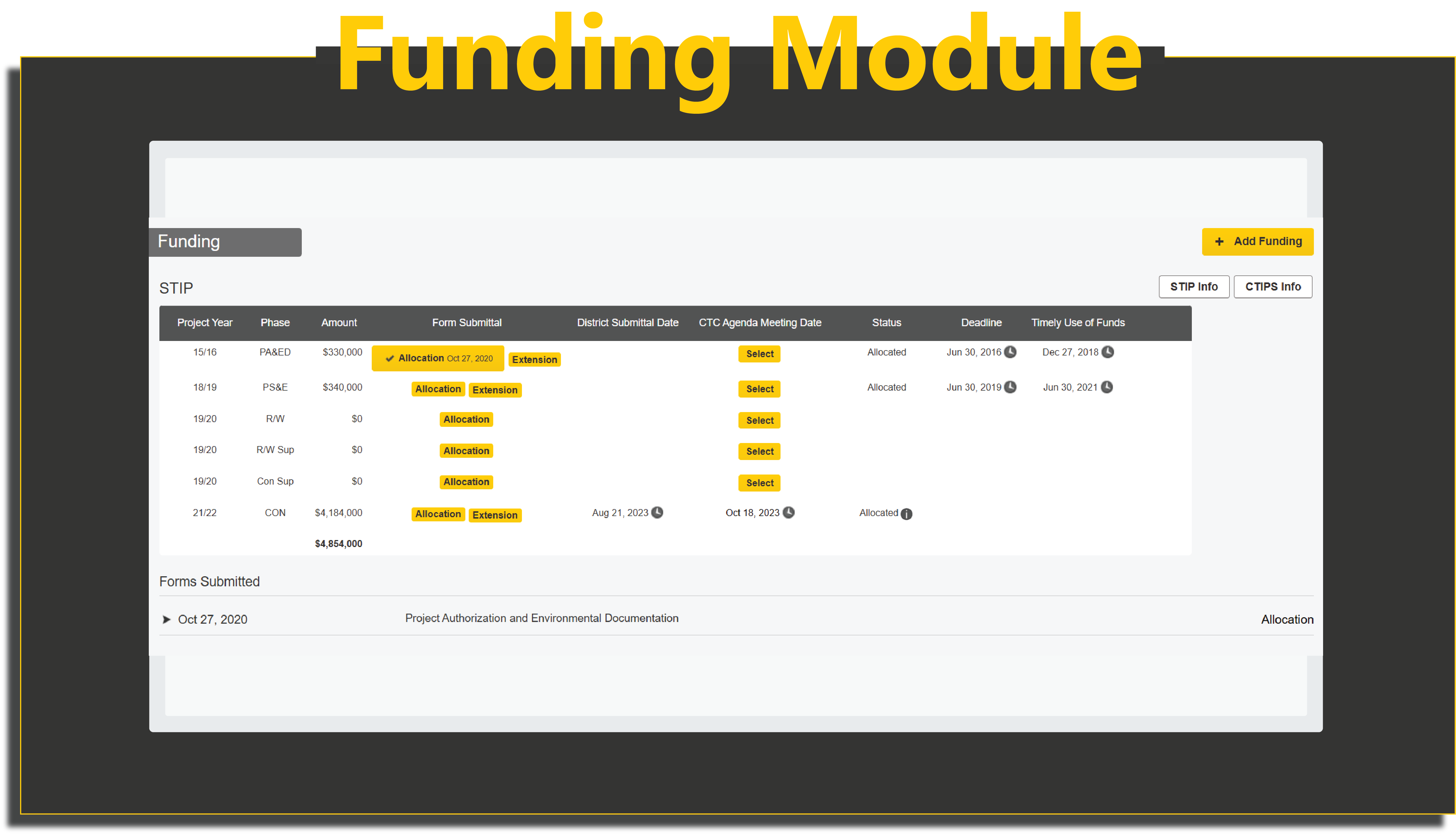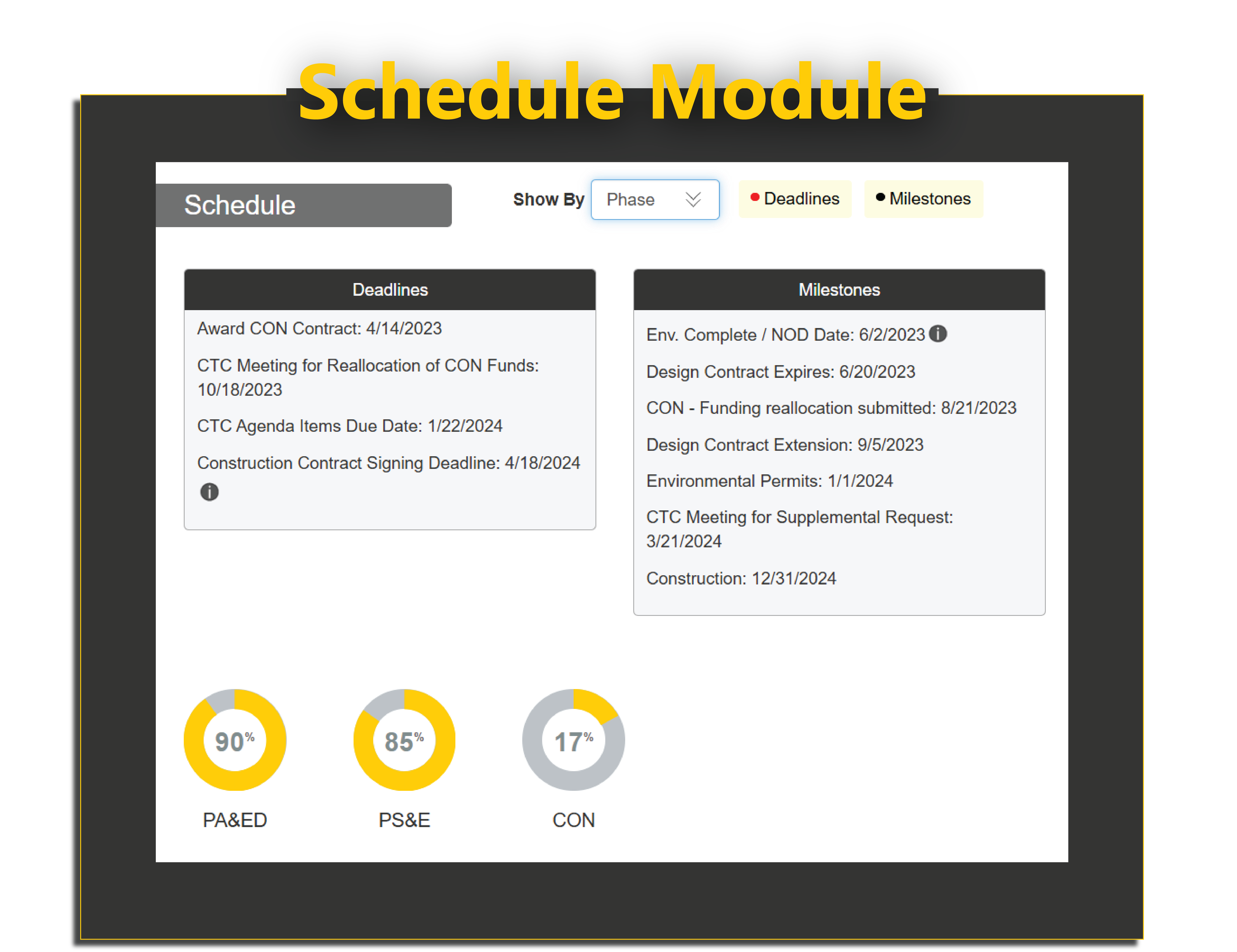 Keep projects aligned with State and Federal funding programs. Using the Funding Module, project managers have critical programming information at their fingertips. View program year, phase, authorization deadlines, CTC agenda dates, obligation milestones, and timely-use-of-funds checkpoints. Set email and banner alerts so key dates never slip.